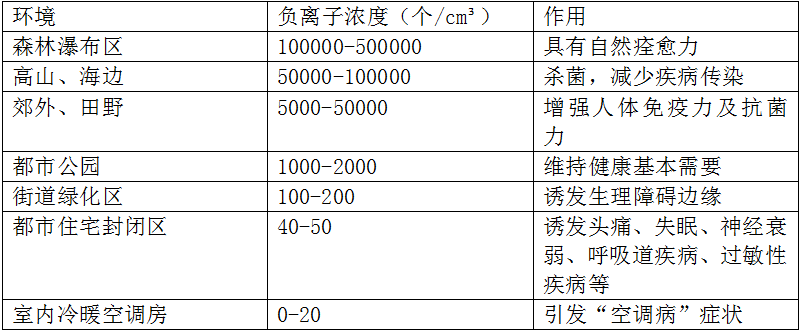 此關系表系為臺灣科技大學葉正濤教授收集整理。由上表可見,負離子對人體的作用極為顯著。早在20世紀30年代,醫學界屆開始利用空氣負離子治療疾病。目前,國內外仍然正在進行著此類研究,例如哮喘、高血壓、糖尿病、支氣管炎、鼻炎、胃炎、神經官能癥和某些關節炎等等。
