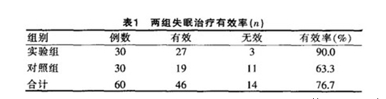 四位專家將香港瑪麗醫(yī)院同期入院的28例患者和征集的32例患者共60例為研究對象(患者均符合CCDM-2-R的失眠癥狀學(xué)診斷標(biāo)準(zhǔn))。其中,失眠時(shí)間大于3周的有10例;失眠持續(xù)時(shí)間小于3周的有20例,并按病程長短分別隨機(jī)入實(shí)驗(yàn)組和對照組。實(shí)驗(yàn)組30例,男10例、女20例,年齡在33-80歲,中位年齡為56歲;對照組30例,男11例、女19例,年齡35-78歲,中位年齡為57歲,病程1周-10年。