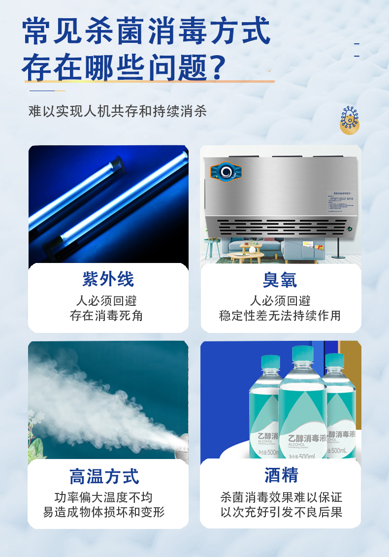 目前,市面上多數(shù)的空氣凈化設(shè)備只能對空氣污染物進(jìn)行簡單過濾。然而,過濾并不等同于消毒,此類空氣凈化設(shè)備的過濾器只能吸附顆粒物,無法吸附病毒等微小的有害物質(zhì),而附著在顆粒物上的細(xì)菌、真菌等可能會在過濾網(wǎng)上滋生、繁殖,并二次污染空氣。其他的空氣殺毒技術(shù),如紫外線照射、臭氧、高溫、酒精等,也都存在殺滅耗時長、人必須回避、無法持續(xù)作用、效果欠佳等問題,難以實(shí)現(xiàn)人機(jī)共存的持續(xù)消殺,無法實(shí)現(xiàn)對細(xì)菌、病毒的快速直接消殺效果。